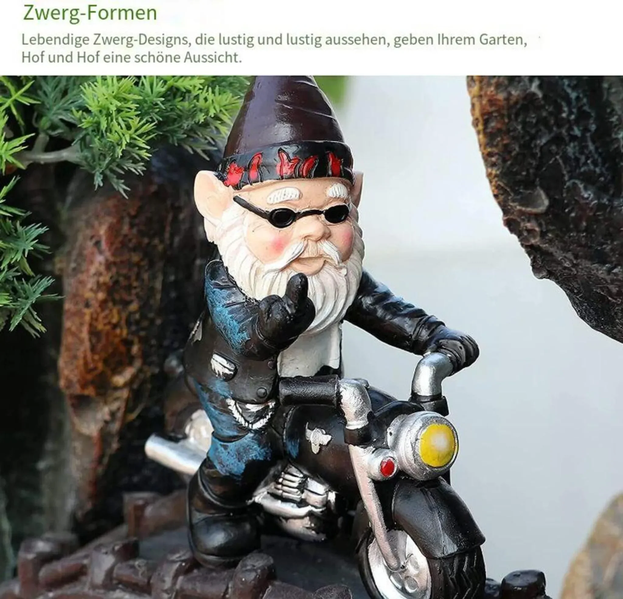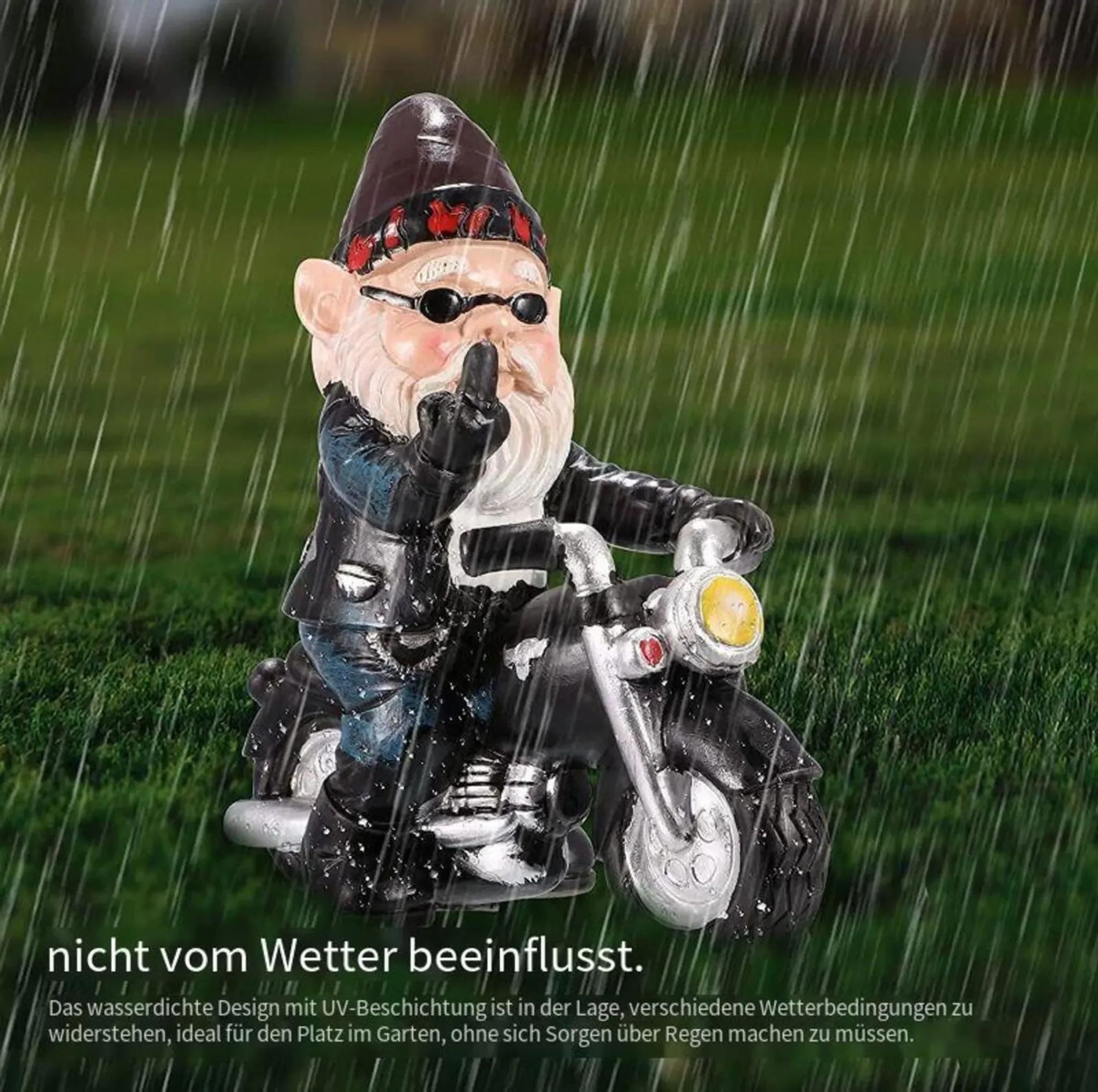 Dieser humorvolle Motorradzerg sorgt für gute Laune im Garten, auf dem Balkon oder im Eingangsbereich. Die Figur begrüßt Gäste mit einem Augenzwinkern und setzt zwischen Pflanzen, Kübeln und Beeten einen originellen dekorativen Akzent.