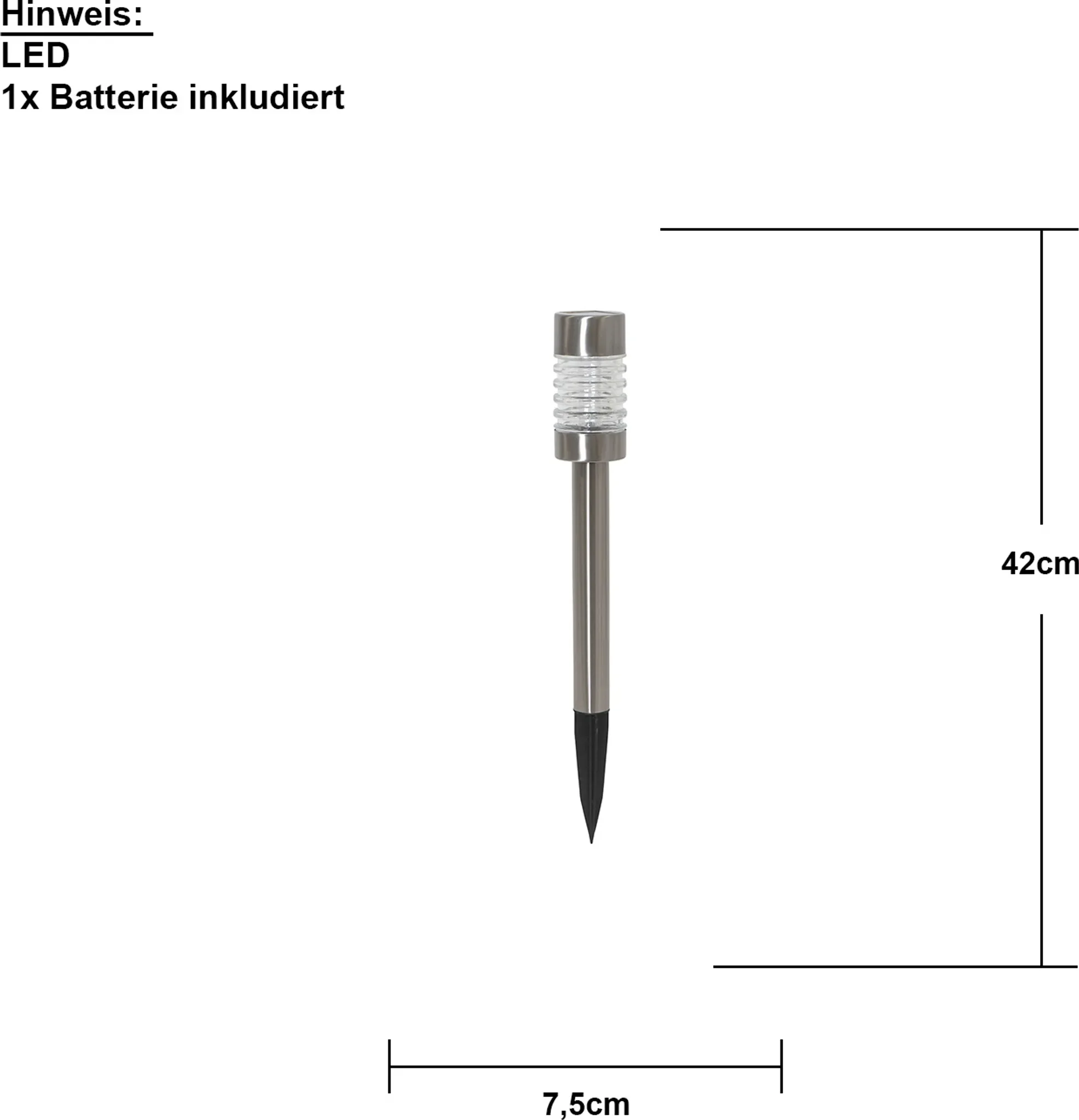| Maße | ca. 42 × 7,5 × 7,5 cm (H×B×T) — kompakte Wegleuchte |